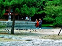 御影堂の両側に、見事な夾竹桃が咲き誇っています。百日紅、木槿も夏に彩りを添えています。僧侶が合掌しながら、鳩に餌を与えておられるのを見かけましたので、遠くから撮らせてもらいました。いつもこのようにして餌を与えておられるのでしょうか。 |
