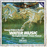 ジョージ一世が、テームズ河で舟遊びを行ったときに、この水上の音楽が演奏されたと言われている。この舟遊びは、1717年6月17日の夜8時から行われテームズ河を往復する間に、この曲が3回演奏されたそうである。チェルシで宴が行われ国王が宮殿に戻ったのが、午前4時半頃だったという。水上の音楽は、金管楽器を含むヘ長調とニ長調の組曲は大編成のオーケストラによる華やかなものなので、舟の上で演奏したと考えられ、ト長調はフルート、リコーダーが使用された室内楽的要素があるので、チェルシの宴に演奏されたと思われる。 トレバー・ピノックは1946年12月生まれで、ロンドンの王立音楽院でオルガンとピアノを学んだ。1973年にオリジナル楽器による室内オーケストラであるイングリッシュ・コンサートを創設して、指揮者兼チェンバロ奏者として活動を始めた。イギリスの古楽器奏者によって構成されていて、メンバーは殆ど固定されている。ピノックの演奏は、生き生きとした楽しい演奏である。 |