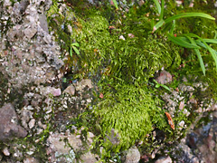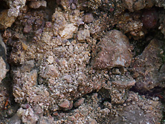 護王神社に日本一の「さざれ石」がありました。君が代に「・・・・さざれ石の巌となりて苔のむすまで」とありますが、そのさざれ石に苔が生えています。この石は岐阜県産で、学名は「石灰質角礫岩(せっかいしつかくれきがん)」といいます。石灰岩が雨水に溶解して周囲の石を集結させてこのような岩になったものです。