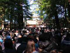 参道はそれほどのことはないのですが、内宮本殿前はご覧のようにビッシリ!! 今の世の中では願い事が多いのか人の動きがあまりありません。これでは混雑するのは当たり前・・・ お賽銭はお札もありましたが、色を見ると10円が圧倒的に多いように思います。