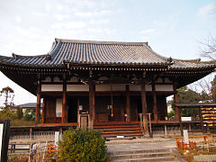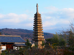 般若寺の本堂、本堂の前にある石灯籠は鎌倉時代後期の作だそうです。そして、重要文化財に指定されている「十三重石塔」があります。今は何もありませんが、ここはコスモスの咲く頃がよく、風に揺れるコスモスを通して見る石塔が、時の流れと哀愁を感じさせる本堂から眺める光景です。