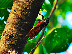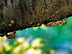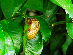 今年は蝉の生息に変化があったようです。最近は、クマゼミが多くなり喧しいくらいに鳴いていたのですが、今年は数が少ないのか、鳴き声があまり聴かなくなっています。その代わりに、昔の主役のアブラゼミの鳴き声がよく聞かれます。来年の主役はどちらになるのでしょうか。そのアブラゼミを写しました。写真右は、アブラゼミとその抜け殻が並んでいました。