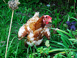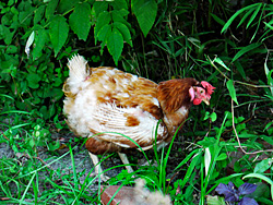 今では、民家で鶏を飼っているところは見かけませんが、放し飼いにしているのか、庭先で餌を啄む名古屋コーチン??を見ました。