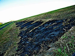 9月も中旬だというのにこの暑さは異常ですね。 しかし、空の雲は入道雲には中途半端な感じです。木津川の土手は、草刈りが行われて草を焼却した後が、点々と残っていました。夕暮れも早くなり、自分の影がこんなにも長く映りました。少しずつ秋が近づいているようです。