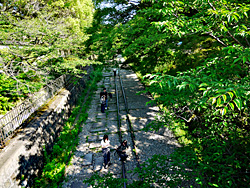 南禅寺周辺を散策しました。 この上をインクラインの線路がありますが、「雄観奇想(ゆうかんきそう)」と書かれたトンネルがあります。第3代京都府知事の北垣国道によるもので、「見事な眺めとすぐれた考えである」という意味です。「ねじりまんぽ」と呼ばれています。「まんぽ」は、トンネルを意味する古い言葉だそうで、ねじりのあるトンネルという意味だそうです。三条通りから南禅寺に向かう道路の造成に伴って建設され、明治21(1888)年6月に完成しました。上部にあるインクラインと斜めに交わる道路に合わせて、トンネルも斜めに掘られ内壁のレンガも螺旋状に積み上げてあります。