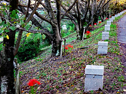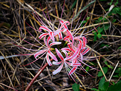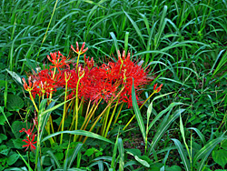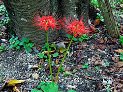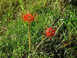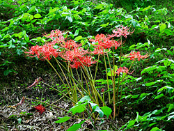 開花が遅れていた「彼岸花」が咲き出し、今が見頃になっています。桜の根元に、点々と咲いています。またの名を「曼珠沙華(マンジュシャゲ)」と言い、歌にも歌われた事でも知られています。梵語(サンスクリット語)で赤い花、「葉に先立って赤花を咲かせる」という意味から名付けられたと言われています。