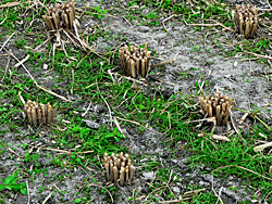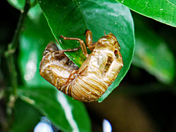 近頃は、蝉の鳴き声が聞かれなくなりましたが、夏の名残り、蝉の抜け殻がありました。普通は、写真左のような抜け殻があちこちにありますが、写真右などは抜け殻が重なり合っています。毎年蝉の抜け殻は見かけますが、こんな状態の空蝉は初めて見ました。