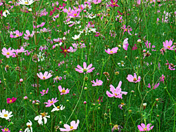 近所で見かけた花々。左から、「サボンソウ」、「コスモス」、そして「モミジアオイ」??? よくわかりません。たぶん違っているでしょう。