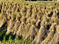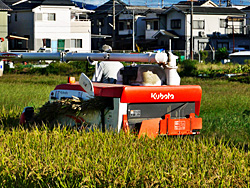 あちこちで、稲刈りが行われています。今はコンバインで、刈り取るのがほどんどですが、一昔前の刈取機で刈っているのを見ました。その前は、鎌で刈っていました。さすがに、伝統行事以外では見ることはありません。