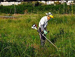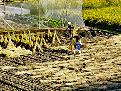 下校する小学生です。畑中の道を帰って行きます。その横で、草刈り作業が行われていました。