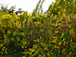 外来種(北アメリカ原産)の、「セイタカアワダチソウ(背高泡立草)」が咲いています。以前は、彼方此方で咲いていて一面を占領していましたが、最近はめっきり衰退して一部でしか咲いていません。栄枯盛衰の感のある背高泡立草です。この花は、喘息や花粉症の原因だとよく聞きましたが、昆虫を媒介して受粉する花、虫媒花(ちゅうばいか)なので、花粉を飛ばすことはないそうです。