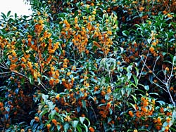 大きく伸びた木に、たくさんのオレンジ色の花を付けていました。モクセイ科の「キンモクセイ(金木犀)で、庭木や街路樹、鉢植えにも利用されています。花は、甘めの強い香りがするので、以前にトイレの芳香剤にキンモクセイの香りを模したものが販売されていたので、トイレを連想する花でも・・・・