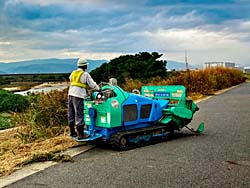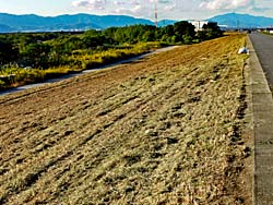 木津川の土手は、2メートル程ある雑草に覆われていますが、車両による草刈りが行われていました。そして、刈り取った草を燃やす大きな焚き火で、左端に人が写っています。