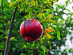 ミソハギ科の落葉高木の「ザクロ(柘榴)」の実が、赤く熟れていました。(写真左・中央) 写真右は、ポポの実かなと思えたのですが???・・・