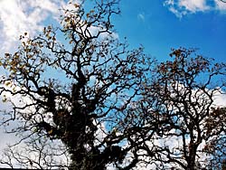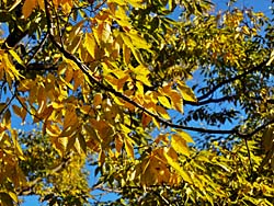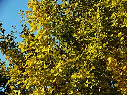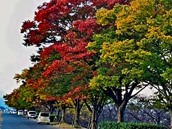 木津川堤の一光景です。紅葉が進んで、緑・黄・赤の三色が青空を背景に光り輝いていました。