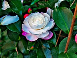 城陽市で多く栽培されている「宇治茶」が、今、花が咲いています。お茶はこの寒い時期に、花を咲かせるのですね。それと、葉ボタンとコスモスが並んで咲いていました。冬と秋の花のコラボです。
