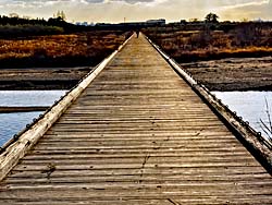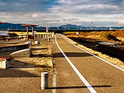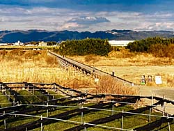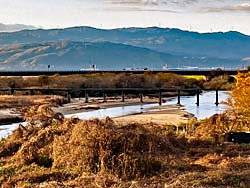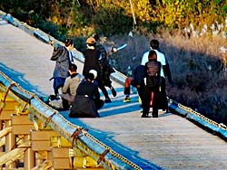 木津川流れ橋(上津屋橋)です。 冬の寒風が吹く橋は、有名な流れ橋でも人は、まばらでした。水量も少なく広い砂場が広がっていました。