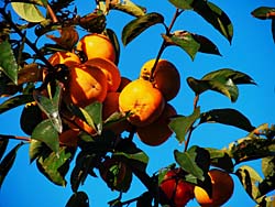 道端から見られた柿の木です。 見た目、次郎柿、富有柿、平無核(ひらたねなし)のような??