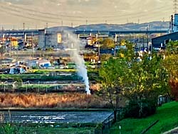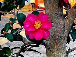 木津川の土手から見た光景です。 田圃から煙が一筋上がっています。昭和の時代では、落葉を燃やして焼き芋を作ったものですが、今は道路は舗装されて焚き火はできません。寒い中テントを張ってバーベキューをしている家族?がいました。そして、そんな光景を「山茶花(サザンカ)」が眺めていました。