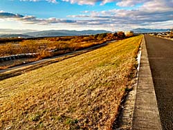 木津川の土手は草刈りが行われて、きれいになっています。遠くに流れ橋(上津屋橋)が見えます。「石田神社遙拝所」と書かれた石標には、葉ボタンが二つ植えられていました。迎春の準備完了です。