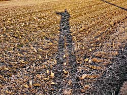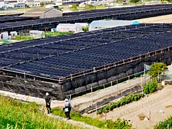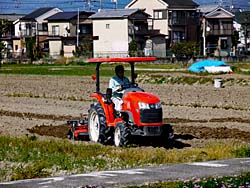 田植えの準備のためにトラクターが、田圃を走り回っていました。 黒いシートに覆われた田畑が数多く見られます。抹茶・玉露など高級茶を収穫するために、日光を遮って新芽を育てています。程なく茶摘みが始まります。 夕方に自分の影が畑に長く伸びて、「あしながおじさん」がいました。