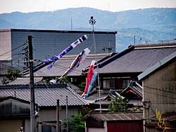 「甍の波と雲の波・・・」、「屋根より高い鯉のぼり・・・」 青空に鯉のぼりが、緑の風を受けて泳いでいました。 それを犬も眺めていました。