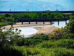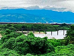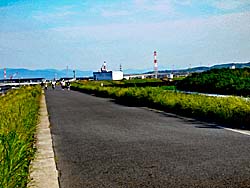 流れ橋(上津屋橋)を渡ると、嵐山まで続くサイクリングロードがあります。流れ橋には休憩所が設置されています。下から見上げると、緑と青の間に休憩所がありました。