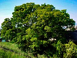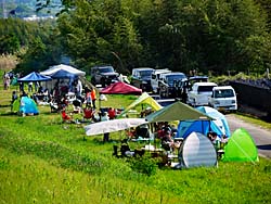 木津川の土手から見た光景です。 遠くに流れ橋が望まれます。 城陽市の名木第1号「上津屋渡し場のエノキ」として認定された、樹高16mの「エノキ(榎)」です。木津川に橋が無かった頃には、上津屋渡し場の目印になっていた木です。 沢山の人がテントを張っていました。焼き肉の匂いが、辺り一面に漂っています。どこもかしこも焼き肉、それ以外の料理もあるでしょうに・・・