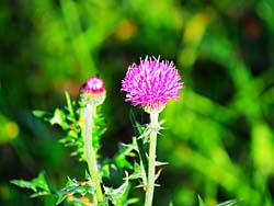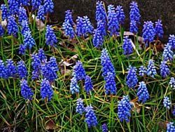 左から、青色のブドウのような、キジカクシ科「ムスカリ」です。「ブドウヒアシンス」という別名もあります。 畑には、マメ科の「レンゲソウ(蓮華草)」いわゆるレンゲが一面に花を咲かせています。窒素を蓄えるので、土壌改良のために植えられています。 キク科の「アザミ(薊)」も咲いていました。