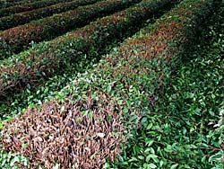 今、お茶摘みが最盛期を迎えています。 茶摘みが終わったものですが、どこを摘んだのかわかりません。(写真左) よく見ると最先端が摘み取られています。(写真中央) 最後は、刈り取り機で丸坊主にされて一年を掛けて育てられます。(写真右) 摘み取られたお茶は、抹茶になるそうです。