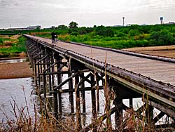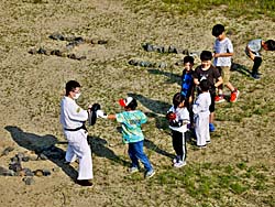 流れ橋(上津屋橋)の光景です。 河原では、空手?少林寺拳法?の体験でしょうか、子供たちが行列を作っていました。 川の中では、子供たちが服のままで泳いでいました。元気なもの・・・