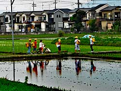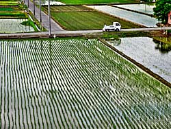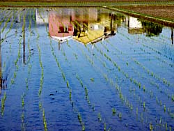 今、田植えが盛んに行われています。 田植えが終わった田圃には、周囲の光景が映り込んでいました。逆さ富士ならぬ逆さ家です。