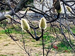 城陽市の名木に登録されている「上津屋渡し場のエノキ」です。木津川に橋が架かっていなかった頃、上津屋の渡し場の目印とされていた木だったそうです。樹高16mあります。 モクレンの蕾です。一カ月後には花が咲き出すのでしょう。 紅梅が咲き出していました。