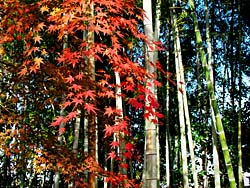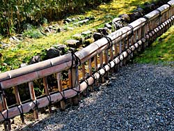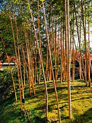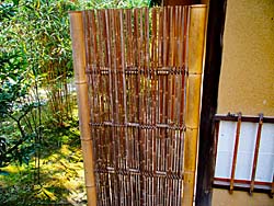 京都府八幡市にある「松花堂庭園」その7です。 「キンメイモウソウチク(金明孟宗竹)」です。その名のとおり金色に輝いています。 そして、「金閣寺垣」です。背の低い透かし垣として代表的な竹垣です。通路と庭の境目や小さな庭の装飾として、よく使用されます。金閣寺にある竹垣から名付けられたと言われています。