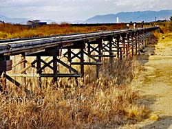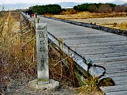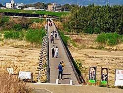 流れ橋(上津屋橋)は、全長356.5m、幅3.3mの日本最大級の木造の橋です。左から城陽市側、八幡市側から撮したものです。そして、八幡市側の橋には俳優の藤田まことが寄贈した「流れ橋