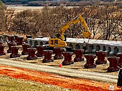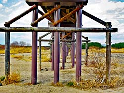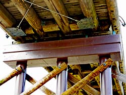 流れ橋の橋脚を撮しました。5本の橋脚の中3本は、コンクリート製で茶色に塗装されて目立たないようになっています。(写真左) 橋を支える部分も同様に造られています。(写真中央) ワイヤーロープで橋脚に固定されています。(写真右) 2015年の復旧工事は、このように大規模な全面補強工事をだったので、総工費約3億5千万円だったそうです。