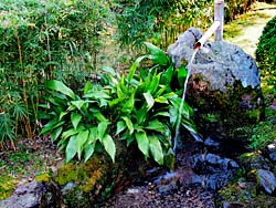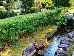 京都府八幡市にある「松花堂庭園」その11です。 「寒竹あやめ垣」(写真左)です。そして、「つくばい」(写真中央)と「クマザサ」(写真右)です。