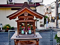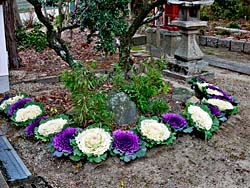 流れ橋を渡ったところにある「石田神社」です。ここにも葉ボタンが植えられていました。今年は思いがけないところに、葉ボタンが植えられています。