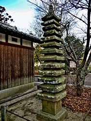 石田神社の鳥居の傍に、十三重の石塔があります。その形状から南北朝時代のものだそうです。四面に仏像が彫られていますが、風化が進んでいます。