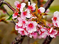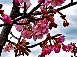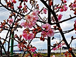 近くの嫁付川(よめつけがわ)に、まだ苗木が少し大きくなった程度の河津桜が、一本植えられています。その河津桜が咲き出しました。今年は、開花が遅れているようで、それだけ寒さが厳しかったということでしょう。いよいよ春到来でしょうか。