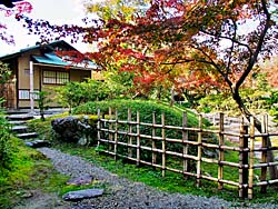 京都府八幡市にある「松花堂庭園」その10です。 「竹隠」という四畳半の茶室で、その名のとおり美しい竹林を望まれます。写真右は、「萩小松明垣(はぎこたいまつがき)」です。