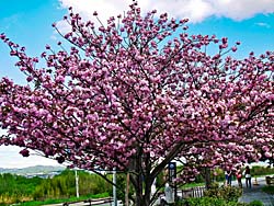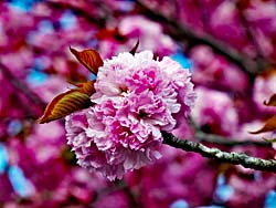 流れ橋を渡ると、嵐山・渡月橋まで続くサイクリングロードがありますが、そこの休憩所に八重桜が一本咲いています。満開でピンクの花を咲かせていました。