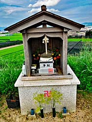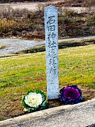 木津川の土手に、お地蔵さんが祀られています。コロナ感染拡大のときは、鈴も取り外されていましたが、現在は写真左のようになっています。一時期写真中央のように、地蔵尊と書かれた提灯もありました。振り返ると、「石田神社遙拝所」の石碑と遠くに流れ橋が望まれます。