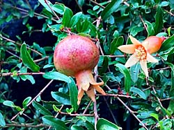 ザクロの花とその実をです。柘榴の花は、きれいな赤色なのですね。咲き終わると、小さな実が出来ていました。 写真右は、ザクロによく似たツバキの実です。