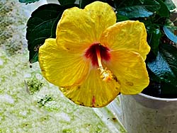 ホームセンター花卉売り場の花です。 夏の花の「ハイビスカス」と秋の七草の一つの「キキョウ(桔梗)」です。