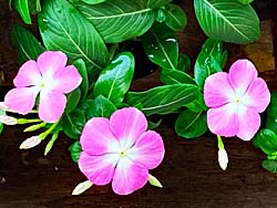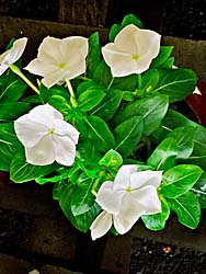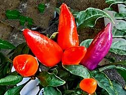 ホームセンター花卉売り場の花です。 マダガスカル原産でキョウチクトウ科の一年草「ニチニチソウ(日々草)」です。(写真左・中央) 熱帯アメリカ原産でナス科の多年草「観賞用トウガラシ」です。(写真右)