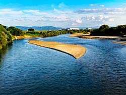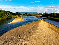 木津川の流れ橋付近は、雨の降水量によって流れが大きく変化します。いつもなら一カ所流れていますが、上流で雨が降ったらしく、中洲を作ったりして流れていました。