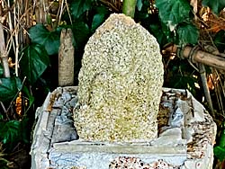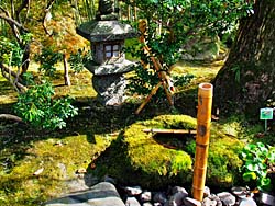 京都府八幡市にある「松花堂庭園」その4です。 庭園に多い竹・笹の「オカメザサ」(写真左)、「ハチク」(写真中央)です。水琴窟がありました。(写真右)動画を撮りましたが、蹲いの音で聞き難いですがその音に混じって、竹の筒から清んだきれいな音が聞こえます。