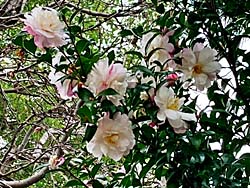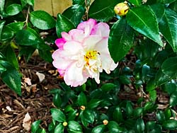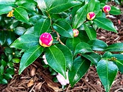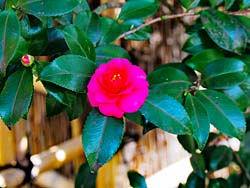 流れ橋を渡った八幡市側に、「石田神社」があります。 境内に一本だけ日本固有種でツバキ科の中高木「サザンカ(山茶花)」が咲いていました。