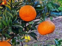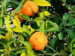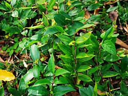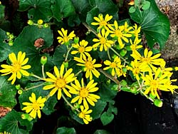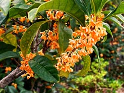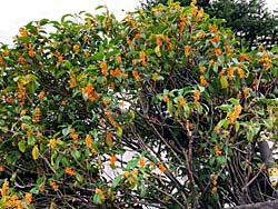 見上げると、中国原産でモクセイ科の常緑小高木「キンモクセイ(金木犀)」です。庭木、花は薬草、香水等に使用される樹木です。足下には、日本原産でキク科の多年草「ツワブキ(石蕗)」(写真右)が咲いていました。